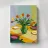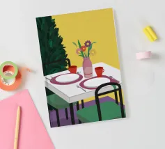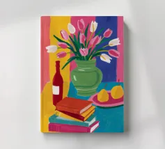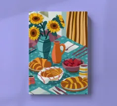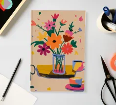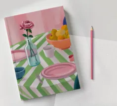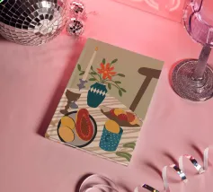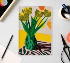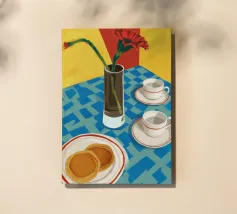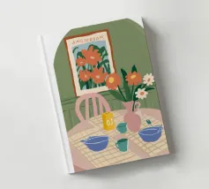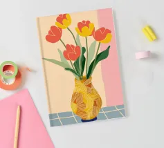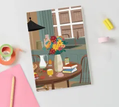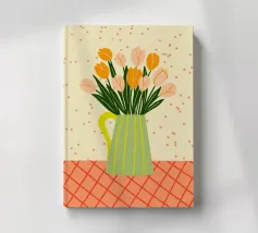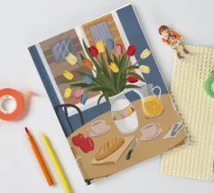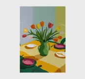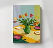 A peaceful interior scene of a kitchen table with a vase of orange tulips. Sliced fruit and bowls are neatly arranged on the yellow tablecloth, viewed from an angle that suggests a quiet, sunlit afternoon.