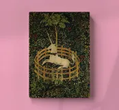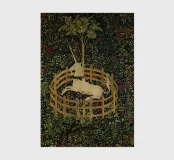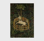 "Unicorn in Captivity" is a captivating tapestry from the late 15th century, part of the series known as "The Unicorn Tapestries." This piece depicts a unicorn enclosed within a fenced area, symbolizing purity and chastity. The intricate design features the mythical creature surrounded by lush foliage, flowers, and ornate details. The tapestry's vibrant colors and elaborate patterns reflect the rich textile artistry of the period and its symbolic significance in medieval culture.