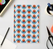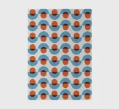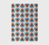 A repetitive geometric pattern features alternating rows of semicircles and circles in blue and rust colors against a light background. The design creates a sense of rhythm and movement through its symmetrical arrangement.