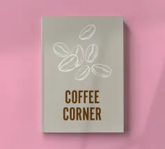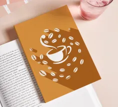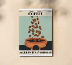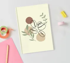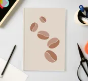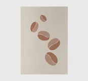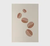 Coffee beans in varying shades of brown appear to float against a light beige background. The minimalist style emphasizes the smooth, rounded shapes of the beans.