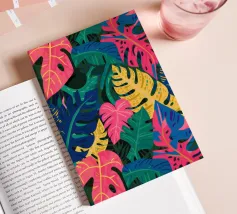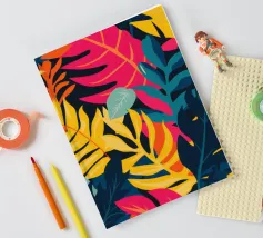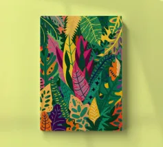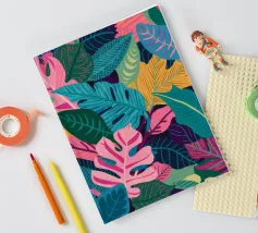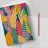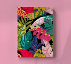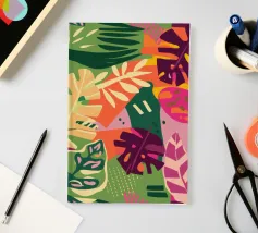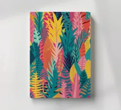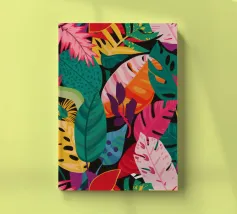 A dense, colorful pattern of overlapping tropical leaves and abstract shapes in bright hues of yellow, pink, blue, and green, creating a joyful, energetic design.