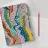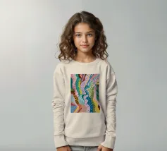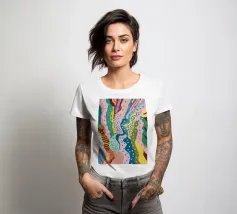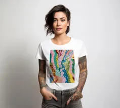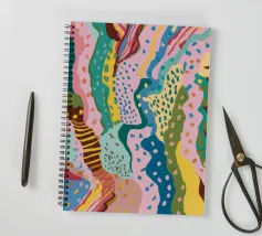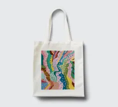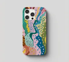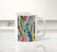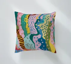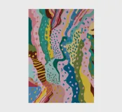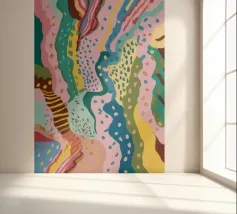 An abstract composition of flowing, wavy lines and organic shapes in a vibrant palette of green, pink, blue, and orange, creating a sense of joyful movement and rhythm.