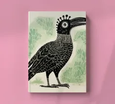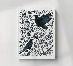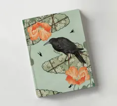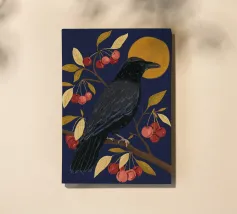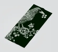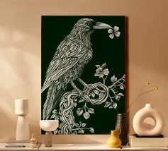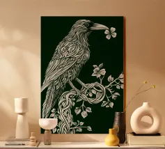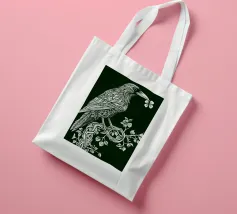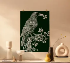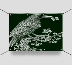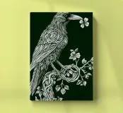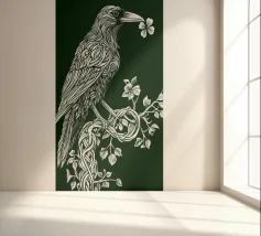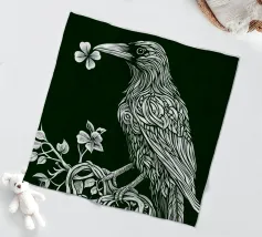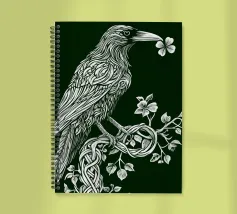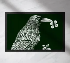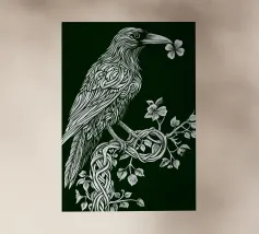 A stylised white raven sits on a detailed branch with a shamrock in its beak. The green background creates a natural yet mystical atmosphere.