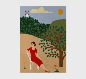An illustration of a woman in a red dress, sitting in a field with an olive tree and a windmill in the background. The scene is a serene, picturesque, and timeless depiction of a peaceful day in the countryside.