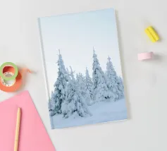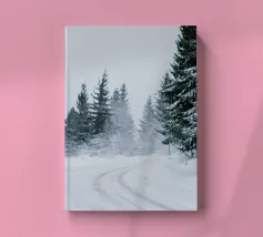 A quiet, snow-covered path leads through a foggy winter forest, framed by delicate fir trees in soft shades of grey and blue. The minimalist composition radiates clarity, peace and Nordic elegance. This tranquil motif brings a wintery atmosphere and meditative naturalness to any room - perfect for murals, mugs, textiles or modern home accents. Winter path, snowy forest, snowy landscape, minimalist winter art, Nordic design, winter calm, snowy trees, serene landscape, winter illustration, cosy winter art, foggy forest, winter decor, alpine style.