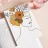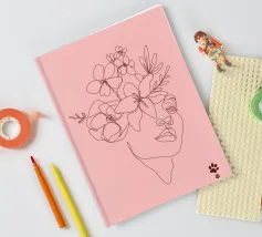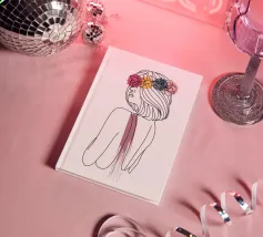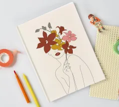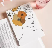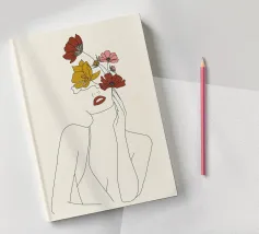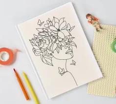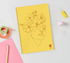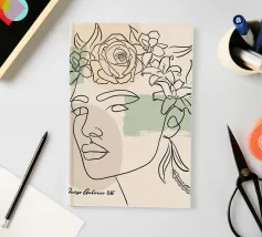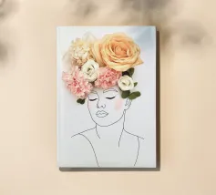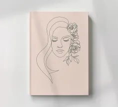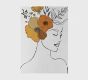 A minimalist line drawing depicts a woman's profile with a serene expression. Her hair is adorned with large, stylized orange and yellow flowers along with delicate leaves.