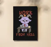 A purple demon goat in a tie sits at a desk with a laptop and coffee, under the phrase “Work From Hell.” The artwork makes a clever pun on daily work feeling like hell, with the demon literally working from hell. Ideal for fans of dark humor, sarcastic office jokes, and anyone who wants to laugh at work struggles.