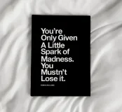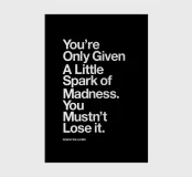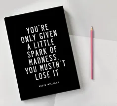 Elevate your space with this striking typography art print featuring Robin Williams' iconic words. The crisp white Helvetica lettering on a deep black background creates a bold, eye-catching contrast. This minimalist design captures the essence of Williams' wit and wisdom, encouraging viewers to embrace their unique spark. Perfect for home offices, living rooms, or as a thoughtful gift, this print adds a touch of inspiration and humour to any decor. High-quality printing ensures lasting vibrancy, making it a timeless addition to your wall art collection