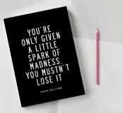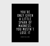 Elevate your space with this striking typography art print featuring Robin Williams' iconic words. The powerful phrase "You Are Only Given a Little Spark of Madness You Must Not Lose It" is elegantly rendered in crisp white modern sans-serif lettering against a deep black background. This high-contrast design creates a bold visual impact, perfect for home offices, living rooms, or creative spaces. A daily reminder to embrace your unique spark, this print inspires creativity and individuality. Ideal for fans of Robin Williams, comedy enthusiasts, or anyone seeking a touch of wit and wisdom!