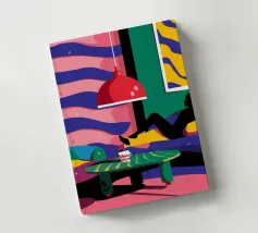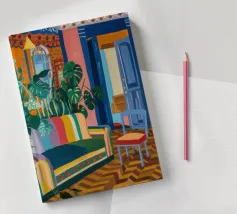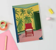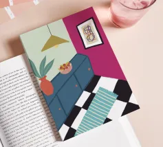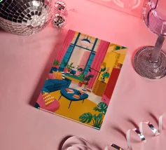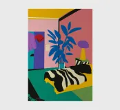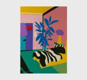 An interior scene shows a vibrant room with blue walls, lush plants, and a bed with a bold zebra print blanket. The composition is a playful and stylish mix of patterns and bright colors, creating a trendy and energetic vibe.
