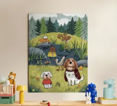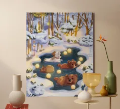 In a whimsical garden, a bear holds a juicy watermelon surrounded by fruits and a lush tree. The lively composition celebrates abundance and nature�s sweetness.