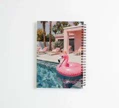 A nostalgic Palm Springs scene: a pink flamingo swim ring drifting in a turquoise pool, framed by soft pastel loungers and towering palms. This artwork brings retro summer spirit, relaxed vacation mood, and mid-century charm to any wall — ideal for living rooms, bedrooms, or stylish poolside decor.