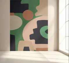 A modern, abstract composition featuring a patchwork of various patterns and shapes. Elements include organic leaf like forms, geometric grids, and abstract textures in a muted palette of pink, black, and beige, reflecting a bohemian, eclectic style.