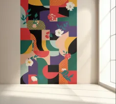 A playful and energetic abstract composition made of various patches of color and patterns, including florals, grids, and stripes, like a vibrant quilt.