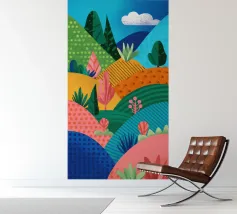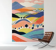 A beautiful landscape of rolling hills and fields, rendered in a colorful patchwork of greens, blues, pinks, and yellows, evoking a sense of idyllic countryside.
