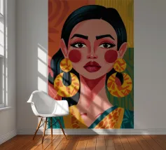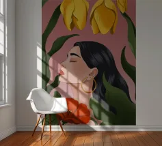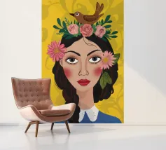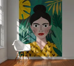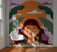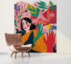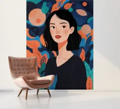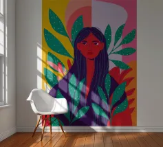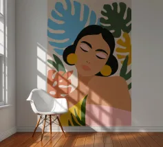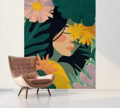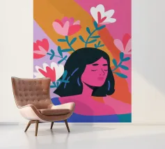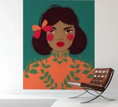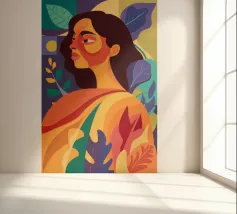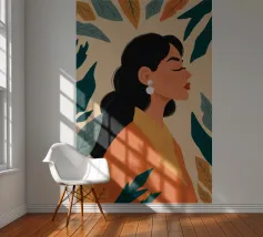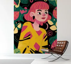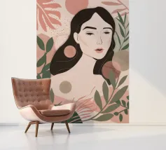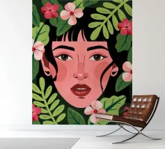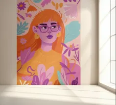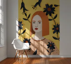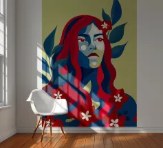 A portrait of a woman with flowing red hair, surrounded by stylized leaves and flowers, looking thoughtfully to the side. The style is modern, bold, and slightly art nouveau.