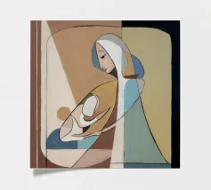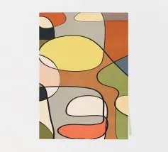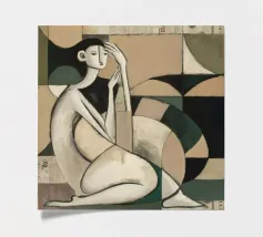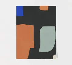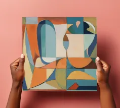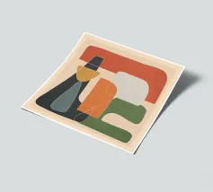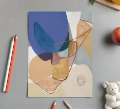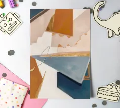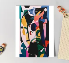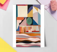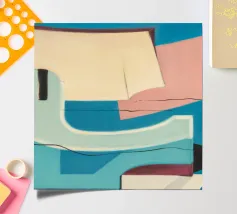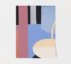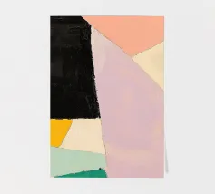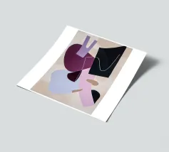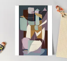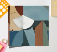 A geometric abstraction composed of overlapping forms in cool and warm tones. The composition plays with space and void, inviting the viewer to interpret its architectural tension and dynamic negative space.