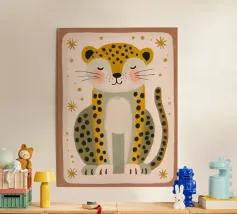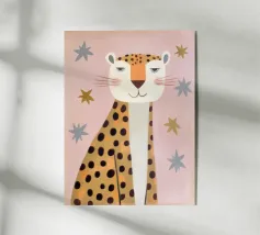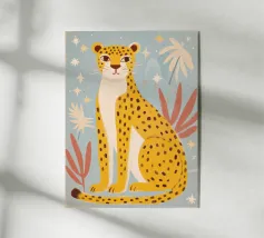 A sweet and softly detailed leopard sits calmly against a warm beige background, surrounded by muted botanical leaves in sage green and soft terracotta tones. With delicate spotted fur, rosy cheeks, and a gentle expression, this charming illustration brings a cozy and comforting feeling to any nursery or child’s room.