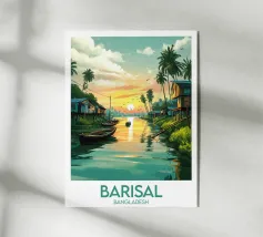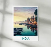 Travel poster illustrating India with a peaceful view of the Ganges at sunrise, traditional boats and typical Indian architecture. Perfect for a wall decoration inspired by Asia and mystical landscapes.