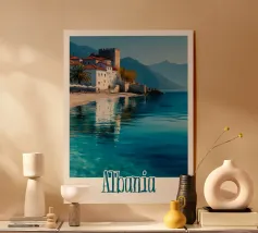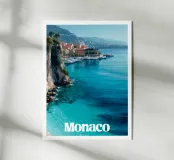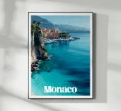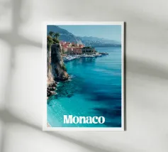 Affiche artistique de Monaco représentant la côte méditerranéenne avec ses falaises, ses palmiers et le port rempli de yachts luxueux. Une décoration murale élégante et raffinée qui capture le charme de la Riviera, idéale pour sublimer un intérieur moderne et voyager depuis son salon.