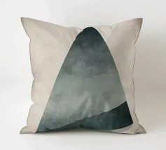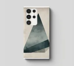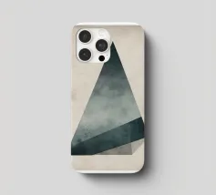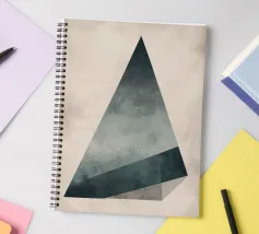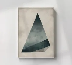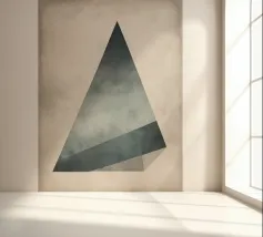 A minimalist image of a three dimensional pyramid shape in dusty tones of gray, beige, and blue.