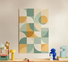 The design features a captivating arrangement of overlapping circles, rectangles, and abstracted leaf shapes, subtly hinting at organic forms within its structured framework. The grainy texture adds depth and visual interest.