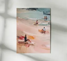 From a lofty vantage, delicate figures dance between sand and sea in a harmonious performance of light and color. Each tiny form, rendered with textured brushstrokes, moves to the rhythm of gentle waves lapping the shore. “Beachside Ballet” celebrates the fleeting beauty of summertime rituals, where sunlit sands and cerulean waters unite in an elegant, dreamlike choreography.