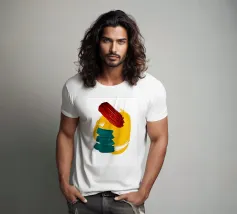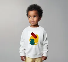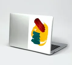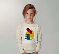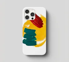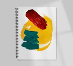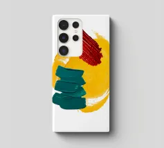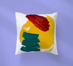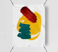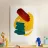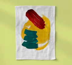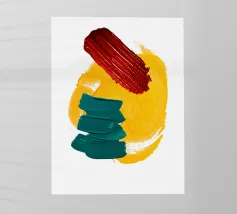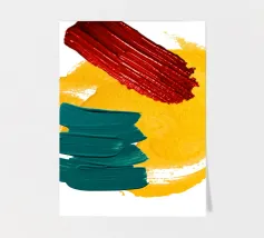 Bold, vibrant brushstrokes in red, yellow, and teal create a striking composition, each color uniquely layered and textured.
