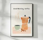 Charming, minimalist illustration featuring the words "Good Morning Coffee", an orange espresso pot and a steaming cup on a delicate background. Warm natural tones and a hand-drawn look give the motif a cosy, modern café atmosphere. Ideal for the kitchen wall, coffee corner or as a stylish gift for coffee lovers.