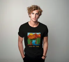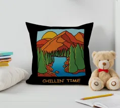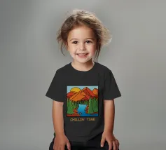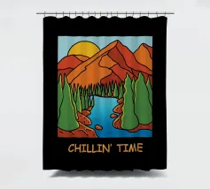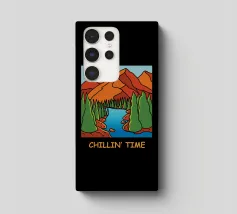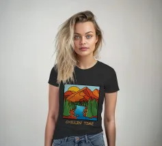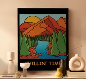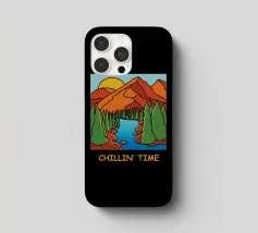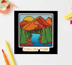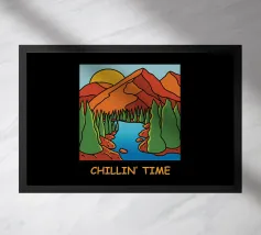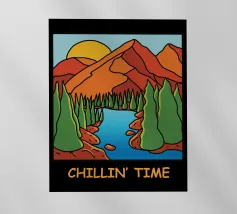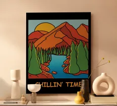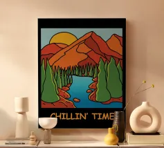 Experience the essence of tranquility with our Chillin Time design, where the sun gently kisses the serene mountain peaks while lush forests embrace the landscape. Noise retro illustration with typography.