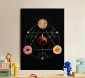 donut sunny-side-up egg cereal bowl coffee splash geometric pattern breakfast foods sprinkles cereal milk splash fried egg cup of coffee breakfast arrangement food presentation circular motif color contrast sugary toppings food symmetry black background pentagram shape sweet and savory combination