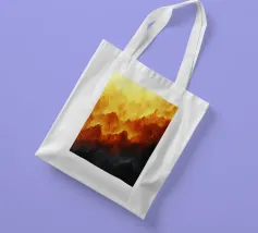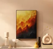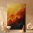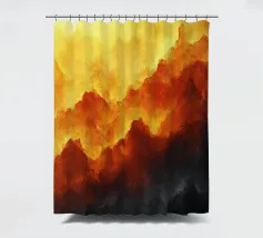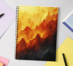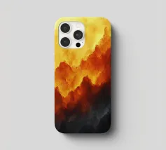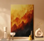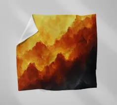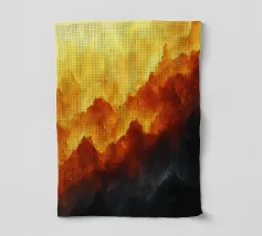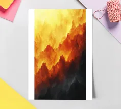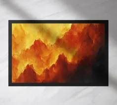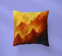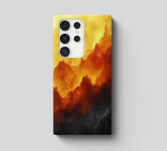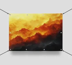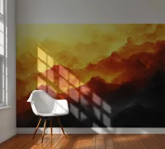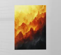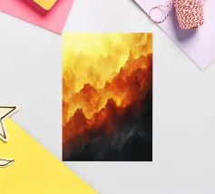 Abstract background with orange and yellow colours, flames in the sky, a mountain landscape, in the style of digital art, an illustration painting with fantasy elements, watercolour brushstrokes, high resolution and a high level of detail, a dark atmosphere and a panoramic view.