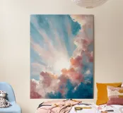A dreamy sky artwork bursting with pastel clouds and golden sunlight. This wall art captures the beauty of serenity and freedom, perfect for creating a soft, feminine atmosphere in your bedroom or living room. Inspired by boho minimalism and dopamine decor trends.