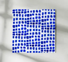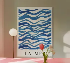 Hand-painted brushstroke waves in shades of cobalt and pale blue. Dynamic with a sense of movement.