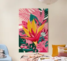 An elegant illustration of tropical leaves and flowers in shades of yellow, orange and red against a light background. A captivating work that evokes the exotic, ideal for a warm, natural setting.