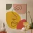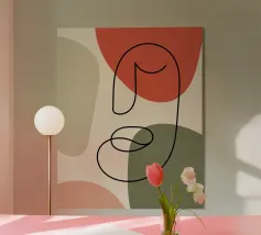 A minimalist design features a continuous black line weaving through colorful geometric shapes, including large circles in various shades. The background is a soft, neutral color that highlights the boldness of the abstract elements.