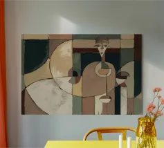 This artwork depicts an abstract composition with curving lines and shapes, rendered in soft colors like beige, brown, and blue. The composition is graceful and fluid, evoking a sense of movement and elegance.