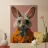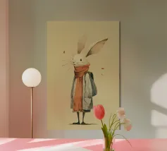 A whimsical yet elegant portrait of a rabbit styled like a fashion icon — wearing a golden trench coat and patterned scarf, set against a soft pastel background. With its expressive eyes and detailed fur, this anthropomorphic artwork blends surrealism, charm, and high fashion aesthetics. Perfect for eclectic interiors, children’s rooms with a playful twist, or contemporary gallery walls, this print adds humor, warmth, and originality to any space.