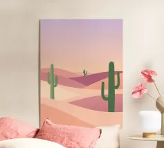 Minimalist desert landscape featuring two cacti under a stylized sun. Layers of earth-toned hills create a serene and warm atmosphere.