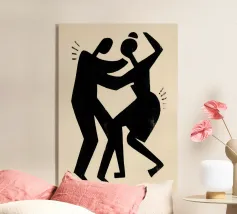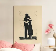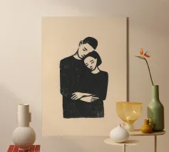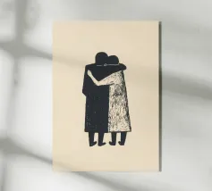 Two abstract figures drawn in black stand side by side, connected by a fine line. Minimalist and clearly contrasting on a light-coloured background, the composition conveys closeness, balance and a silent communication between the forms.
