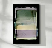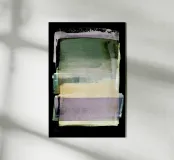 Abstrakte Mixed Media Collage in grün, mauve, violett, gelb vor schwarzem Untergrund. Überlagerung von Farbfeldern.
