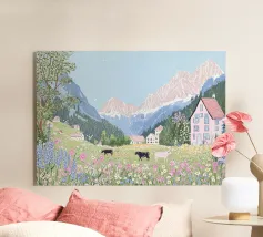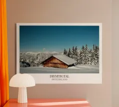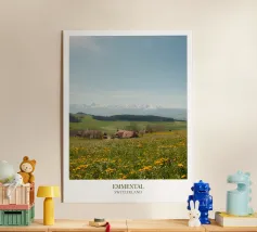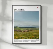 Rolling green hills, quiet valleys, and scattered farmhouses define the timeless character of the Emmental. Soft light drifts across open pastures and gentle ridgelines, creating a sense of calm and wide rural space. This artwork brings the peaceful heart of Switzerland into your home — warm, natural, and beautifully grounded.