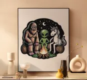 A yeti, an alien, and a unicorn are gathered around a campfire under a starry night sky. The whimsical scene combines elements of fantasy and outer space in a friendly setting.