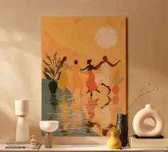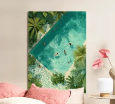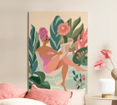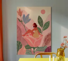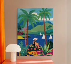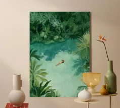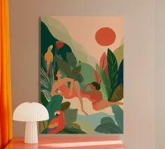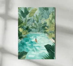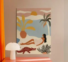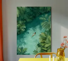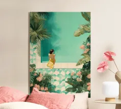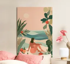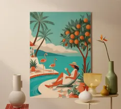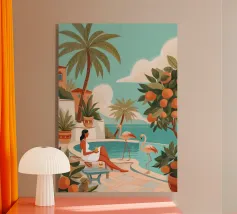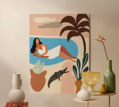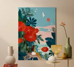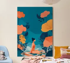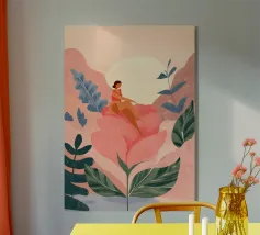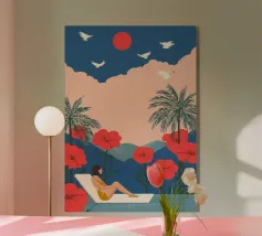 Amid towering coral poppies and feathery palms, a woman reclines peacefully beneath a bold red sun, floating on a pool of quiet. White birds soar across a dreamlike sky, echoing the stillness of her pose. Set against rich indigo mountains and a tangerine sky, the scene captures a surreal harmony between nature and self — a suspended moment where time blooms, and thought dissolves into color and calm.