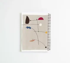Abstract shapes are connected by thin, black lines on a light beige background, creating a sense of balance. The composition features various geometric forms in different colors, including brown, red, blue, white, and yellow.