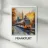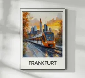 Poster showing a modern tram travelling through Frankfurt at sunset, with the city skyline and autumn trees in the background. A captivating, warm urban scene for a unique wall decoration.