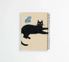 A simple, minimalist illustration of a large black cat lying down with a small blue mouse sitting on its back. The style is charming and clean.