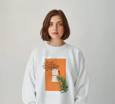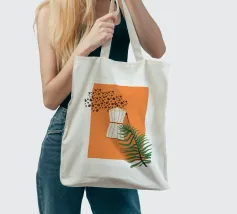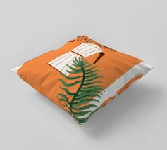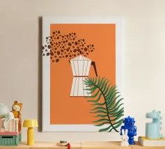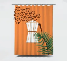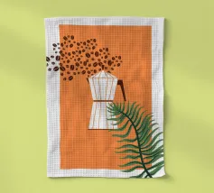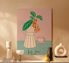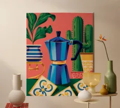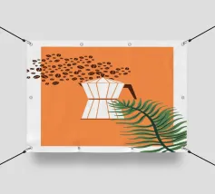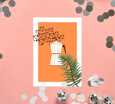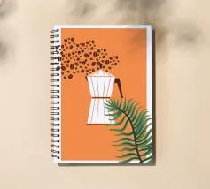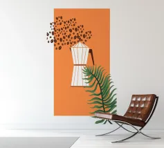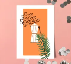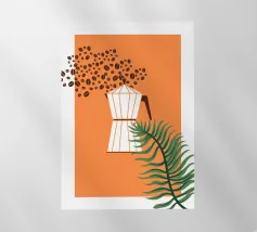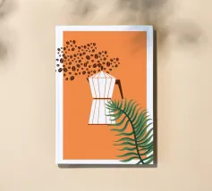 A geometric coffee pot is surrounded by scattered coffee beans, set against an orange background. A green leafy plant contrasts with the warm tones, adding a natural element to the scene.