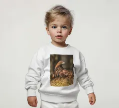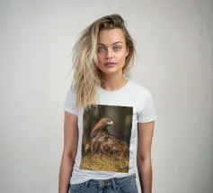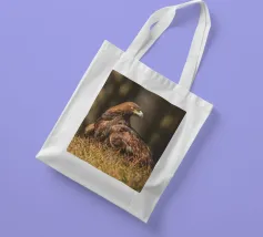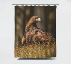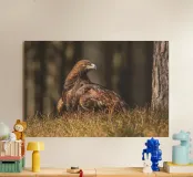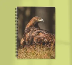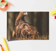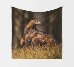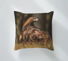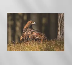 A Golden Eagle perched on autumnal woodland floor.