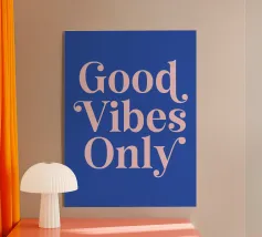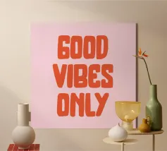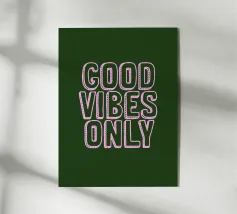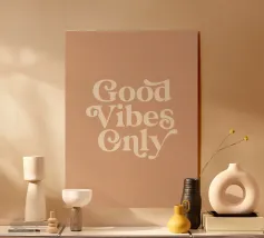 Infuse your space with positivity using this retro-inspired typography art print. The uplifting phrase "Good Vibes Only" pops in soft peach retro lettering against a rich, deep petrol green background. This eye-catching piece combines vintage charm with a modern mantra, perfect for adding a touch of optimism to any room. From living areas to home offices, this artwork brightens the mood and promotes a positive atmosphere. Let this stylish print serve as a daily reminder to embrace good energy and maintain an upbeat outlook on life.